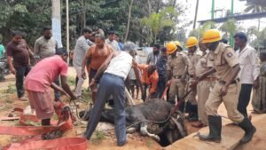 ಸ್ಥಳಕ್ಕೆ ಬಂದ ಅಗ್ನಿಶಾಮಕ ಸಿಬ್ಬಂದಿ ಹಗ್ಗ ಹಾಗೂ ಓಸ್ ಪೈಪ್ ಗಳ ಮೂಲಕ ಹಸುವನ್ನು ಸುರಕ್ಷಿತವಾಗಿ ಮೇಲೆ ತೆಗೆದರು. ರಕ್ಷಣಾ ಕಾರ್ಯಾಚರಣೆ ವೇಳೆ ಹಸುವಿಗೆ ಸಣ್ಣಪುಟ್ಟ ಗಾಯಗಳಾದವು. ಪಶುವೈದ್ಯರನ್ನು ಕರೆಸಿ ಚಿಕಿತ್ಸೆ ಕೊಡಿಸಲಾಯಿತು.