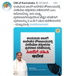 ಉಡುಪಿಯ ಖಾಸಗಿ ಕಾಲೇಜಿನ ಶೌಚಾಲಯದಲ್ಲಿ ವೀಡಿಯೋ ಚಿತ್ರೀಕರಣ ನಡೆಸಲಾಗಿದೆ ಎಂಬ ಆರೋಪವಿದ್ದು, ಇದು ಸೂಕ್ಷ್ಮ ಪ್ರಕರಣವಾಗಿರುವುದರಿಂದ ಹೆಚ್ಚಿನ ತನಿಖೆಗಾಗಿ ಪ್ರಕರಣವನ್ನು ಸಿಐಡಿಗೆ ವಹಿಸಿ ಆದೇಶಿಸಲಾಗಿದೆ ಎಂದು ಸಿಎಂ ಸಿದ್ದರಾಮಯ್ಯ ಟ್ವೀಟ್ ಮಾಡುವ ಮೂಲಕ ತಿಳಿಸಿದ್ದಾರೆ.