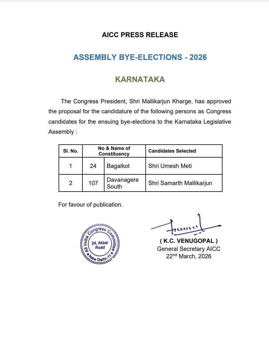 ಉಪಚುನಾವಣೆಗೆ ರಾಜ್ಯ ಕಾಂಗ್ರೆಸ್ ನಲ್ಲಿ ಟಿಕೆಟ್ ಹಂಚಿಕೆ ಕಗ್ಗಂಟು ಇಂದು ಬಗೆಹರಿದಿದೆ. ಏಪ್ರಿಲ್ 9 ರಂದು ನಡೆಯಲಿರುವ ರಾಜ್ಯದ ಎರಡು ಪ್ರಮುಖ ವಿಧಾನಸಭಾ ಕ್ಷೇತ್ರಗಳ ಉಪಚುನಾವಣೆಗೆ ಕಾಂಗ್ರೆಸ್ ತನ್ನ ಅಭ್ಯರ್ಥಿಗಳ ಹೆಸರನ್ನು ಇಂದು ಭಾನುವಾರ ಅಧಿಕೃತವಾಗಿ ಘೋಷಣೆ ಮಾಡಿದೆ.