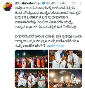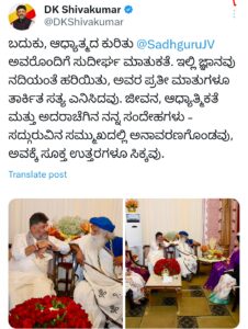 ಸದ್ಗುರು ಅವರ ಮಾತುಗಳಲ್ಲಿ ಆಳವಾದ ತತ್ವಗಳ ಜೊತೆ ಸೌಮ್ಯವಾದ ಹಾಸ್ಯದ ಸಂಯೋಜನೆ ಇರುತ್ತದೆ. ಬದುಕಿನ ಒಳಹುಗಳ ಬಗ್ಗೆ ಸುದೀರ್ಘವಾಗಿ ಮಾತನಾಡಿದೆವು. ಗಂಭೀರ ವಿಚಾರಗಳ ಮಧ್ಯೆ, ಹಾಸ್ಯದ ಝಲಕ್ ಗಳು ಮನಸ್ಸಿಗೆ ಹಿತ ನೀಡಿದವು ಎಂದು ಎಕ್ಸ್ ಖಾತೆಯಲ್ಲಿ ಡಿಸಿಎಂ ಡಿಕೆಶಿ ಬರೆದುಕೊಂಡಿದ್ದಾರೆ.