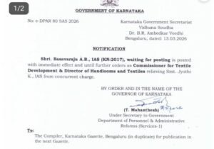 ಜವಳಿ ಅಭಿವೃದ್ಧಿ ಆಯುಕ್ತರು ಮತ್ತು ಕೈಮಗ್ಗ ಮತ್ತು ಜವಳಿ ನಿರ್ದೇಶಕರಾಗಿ ಎ.ಬಿ.ಬಸವರಾಜು ಅವರು ನೇಮಕಗೊಂಡಿದ್ದಾರೆ…