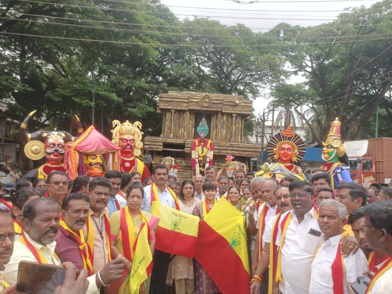ನಂತರ ಆಸ್ಪತ್ರೆ ವೃತ್ತ, ರಂಗಪ್ಪ ಸರ್ಕಲ್, ಅರಳುಮಲ್ಲಿಗೆ ಬಾಗಿಲು, ಕೆ.ಸಿ.ಪಿ ವೃತ್ತ, ಕೊಂಗಾಡಿಯಪ್ಪ ಪ್ರೌಢಶಾಲೆ, ಇಸ್ಲಾಂಪುರ, ತಾಲ್ಲೂಕು ಕಚೇರಿ ವೃತ್ತದ ತನಕ ನಡೆದ ಆದ್ದೂರಿ ಮೆರವಣಿಗೆಯಲ್ಲಿ ವಿವಿಧ ಶಾಲೆಗಳ ವಿದ್ಯಾರ್ಥಿಗಳು ಮತ್ತು ಕನ್ನಡಪರ ಸಂಘಟನೆಗಳು ಕನ್ನಡ ಭಾವುಟ ಹಿಡಿದು ಸ್ವಾಗತಿ, ಪುಷ್ಪ ನಮನ ಸಲ್ಲಿದರು.