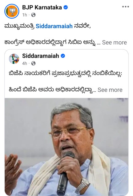 ಕಾಂಗ್ರೆಸ್ ಅಧಿಕಾರದಲ್ಲಿದ್ದಾಗ ಸಿಬಿಐ ಅನ್ನು “ಕಾಂಗ್ರೆಸ್ ಬ್ಯೂರೋ ಆಫ್ ಇನ್ವೆಸ್ಟಿಗೇಷನ್” ಆಗಿ ಬಳಸಿಕೊಂಡ ಕರಾಳ ಇತಿಹಾಸವನ್ನು ದೇಶ ಮರೆತಿಲ್ಲ. ಸಿಬಿಐಗೆ ಏಳೆಂಟು ಪ್ರಕರಣಗಳನ್ನು ಕೊಟ್ಟೆವು ಎಂದು ಹೇಳುತ್ತೀರಿ, ಆದರೆ ಅರ್ಕಾವತಿ ಲೇಔಟ್ ರೀ-ಡೂ ಹಗರಣ, ಕೆಂಪಣ್ಣ ಆಯೋಗದ ವರದಿ ಏನಾಯಿತು? ಅದನ್ನು ಮುಚ್ಚಿ ಹಾಕಲು ಎಸಿಬಿ ರಚಿಸಿ, ಲೋಕಾಯುಕ್ತದ ಕತ್ತು ಹಿಸುಕಿದ್ದು ಯಾರು? ಎಂದು ಸಿಎಂ ಸಿದ್ದರಾಮಯ್ಯನವರನ್ನು ಕರ್ನಾಟಕ ಬಿಜೆಪಿ ಪ್ರಶ್ನೆ ಮಾಡಿದೆ….