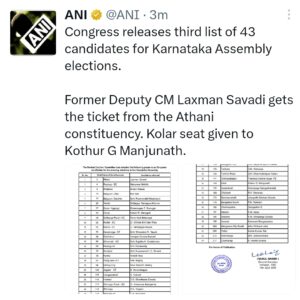ಅಥಣಿ ಕ್ಷೇತ್ರದಿಂದ ಮಾಜಿ ಉಪ ಮುಖ್ಯಮಂತ್ರಿ ಲಕ್ಷ್ಮಣ ಸವದಿ ಟಿಕೆಟ್ ಪಡೆದಿದ್ದಾರೆ. ಕೋಲಾರ ಸೀಟು ಕೋತ್ತನೂರು ಜಿ.ಮಂಜುನಾಥ್ಗೆ ನೀಡಲಾಗಿದೆ.