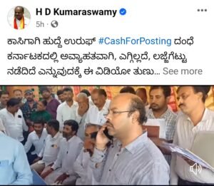 ಕಾಸಿಗಾಗಿ ಹುದ್ದೆ ಉರುಫ್ #CashForPosting ದಂಧೆ ಕರ್ನಾಟಕದಲ್ಲಿ ಅವ್ಯಾಹತವಾಗಿ, ಎಗ್ಗಿಲ್ಲದೆ, ಲಜ್ಜೆಗೆಟ್ಟು ನಡೆದಿದೆ ಎಂದು ಮಾಜಿ ಸಿಎಂ ಕುಮಾರಸ್ವಾಮಿ ಆರೋಪಿಸಿ ಯತೀಂದ್ರ ಹಾಗೂ ಸಿಎಂ ನಡುವಿನ ಸಂಭಾಷಣೆ ಕುರಿತಾದ ವಿಡಿಯೋ ತುಣುಕನ್ನ ತಮ್ಮ ಸಾಮಾಜಿಕ ಜಾಲತಾಣಗಳಲ್ಲಿ ಹರಿಬಿಟ್ಟಿದ್ದಾರೆ.