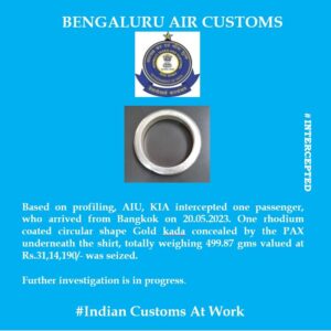 ಮೇ 20 ರಂದು ಬ್ಯಾಂಕಾಕ್ ನಿಂದ ದೇವನಹಳ್ಳಿ ಕೆಂಪೇಗೌಡ ಅಂತರಾಷ್ಟ್ರೀಯ ವಿಮಾನ ನಿಲ್ದಾಣಕ್ಕೆ ಬಂದ ಪ್ರಯಾಣಿಕನ ಮೇಲೆ ಸಂಶಯ ಬಂದ ಹಿನ್ನಲೆ, ಬೆಂಗಳೂರು ಕಸ್ಟಮ್ಸ್ ಅಧಿಕಾರಿಗಳು ಆತನನ್ನ ವಶಕ್ಕೆ ಪಡೆದು ತಪಾಸಣೆ ನಡೆಸಿದ್ದಾಗ, ಪ್ರಯಾಣಿಕನ ಬಳಿ ಕೈ ಕಡಗ ಪತ್ತೆಯಾಗಿದೆ, ಚಿನ್ನದ ಕಡಗಕ್ಕೆ ರೇಡಿಯಮ್ ಲೇಪಿಸಿ ಕಳ್ಳ ಸಾಗಣಿಕೆಗೆ ಯತ್ನಸಿದ್ದ, ಆರೋಪಿಯಿಂದ 499.87 ಗ್ರಾಂ ತೂಕದ 31,14,190 ರೂಪಾಯಿ ಮೌಲ್ಯ ಚಿನ್ನ ವಶಕ್ಕೆ ಪಡೆಯಲಾಗಿತ್ತು.