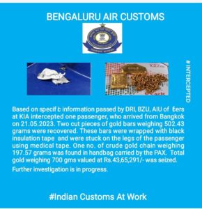 ಕೂಡಲೇ ಬೆಂಗಳೂರು ಕಸ್ಟಮ್ಸ್ ಅಧಿಕಾರಿಗಳಿಗೆ ಮಾಹಿತಿಯನ್ನ ನೀಡಿದ್ದಾರೆ, ವಿಚಾರಣೆಗಾಗಿ ಆರೋಪಿತ ಪ್ರಯಾಣಿಕನನ್ನ ಬೆಂಗಳೂರು ಕಸ್ಟಮ್ಸ್ ಅಧಿಕಾರಿಗಳು ವಶಕ್ಕೆ ಪಡಿದ್ದಾರೆ, ತಪಾಸಣೆ ನಡೆಸಿದ್ದಾಗ ಆರೋಪಿ ತನ್ನ ಕಾಲಿಗೆ ಮೆಡಿಕಲ್ ಟೇಪ್ ಸುತ್ತಿಗೊಂಡಿದ್ದ, ಅದರೊಳಗೆ ಮರೆಮಾಚಿ ಚಿನ್ನವನ್ನ ಅಡಗಿಸಿಟ್ಟಿದ್ದ, ಆತನಿಂದ 700 ಗ್ರಾಂ ತೂಕದ 43,65,291 ರೂಪಾಯಿ ಮೌಲ್ಯದ ಎರಡು ಚಿನ್ನದ ಬಿಸ್ಕತ್ತು ಮತ್ತು ಚಿನ್ನದ ಚೈನ್ ವಶಕ್ಕೆ ಪಡೆಯಲಾಗಿದೆ. ಹೆಚ್ಚಿನ ವಿಚಾರಣೆಯನ್ನ ಅಧಿಕಾರಿಗಳು ಮುಂದುವರೆಸಿದ್ದಾರೆ.