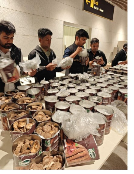ಶ್ರೀಲಂಕಾದ ಹ್ಯಾಂಡ್ಲರ್ ನಿಂದ 14 ಕೆ ಜಿ ಹೈಡ್ರೋಗಾಂಜಾ ಮತ್ತು 2 ಕೆಜಿ ಅಣಬೆ ವಶಕ್ಕೆ ಪಡೆಯಲಾಗಿದೆ. 250 ಫುಡ್ ಟಿನ್ ಗಳಲ್ಲಿ ಡ್ರಗ್ಸ್ ಸೀಲ್ ಮಾಡಿಕೊಂಡು ಬಂದಿದ್ದ ಆರೋಪಿಗಳು.