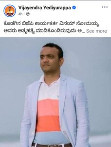 ಕೊಡಗಿನ ಬಿಜೆಪಿ ಕಾರ್ಯಕರ್ತ ವಿನಯ್ ಸೋಮಯ್ಯ ಅವರು ಆತ್ಮಹತ್ಯೆ ಮಾಡಿಕೊಂಡಿರುವುದು ಅತ್ಯಂತ ನೋವಿನ ಸಂಗತಿ. ಆತ್ಮಹತ್ಯೆ ಹಿನ್ನೆಲೆಯಲ್ಲಿ ಕೂಲಂಕುಶವಾಗಿ ಪಾರದರ್ಶಕ ತನಿಖೆ ನಡೆದು ಸತ್ಯ ಹೊರಬರಬೇಕಿದೆ ಎಂದು ಬಿಜೆಪಿ ರಾಜ್ಯಾಧ್ಯಕ್ಷ ಬಿ.ವೈ.ವಿಜಯೇಂದ್ರ ಆಗ್ರಹಿಸಿದ್ದಾರೆ.