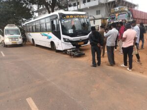 ರಘುನಾಥಪುರದಿಂದ ಬೈಕ್ ಬರುತ್ತಿತ್ತು, ಡಿಕ್ರಾಸ್ ಕಡೆಯಿಂದ ಖಾಸಗಿ ಕಂಪನಿ ಬಸ್ ಆಗಮಿಸುತ್ತಿತ್ತು. ಮೊದಲು ಬೈಕ್ ಗೆ ಕಾರೊಂದು ಡಿಕ್ಕಿ ಹೊಡೆದಿದ್ದು, ಡಿಕ್ಕಿ ರಭಸಕ್ಕೆ ಬಸ್ಸಿನಡಿ ಬೈಕ್ ಬೀಳುತ್ತದೆ. ಸುಮಾರು 100 ಮೀ. ದೂರದಷ್ಟು ಬೈಕ್ ನ್ನು ಬಸ್ ಎಳೆದೊಯ್ದಿದೆ. ಈ ವೇಳೆ ಬೈಕ್ ಸವಾರರು ಗಂಭೀರ ಗಾಯಗೊಂಡಿರುತ್ತಾರೆ. ಕೂಡಲೇ ಗಾಯಾಳುಗಳನ್ನು ಆಸ್ಪತ್ರೆಗೆ ರವಾನಿಸಲಾಗಿದೆ ಎಂದು ಪ್ರತ್ಯಕ್ಷದರ್ಶಿಗಳು ತಿಳಿಸಿದ್ದಾರೆ.
