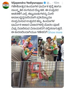 ‘ಗಣಪತಿ ಮೂರ್ತಿಯನ್ನೂ ಪೊಲೀಸ್ ವಾಹನದಲ್ಲಿ ಬಂಧಿಸಿಟ್ಟಿದ್ದು’ ಖಂಡನೀಯ- ‘ಹಿಂದೂ ಸಮಾಜದ ಧಾರ್ಮಿಕ ಭಾವನೆಯನ್ನು ಕೆರಳಿಸುವ ಕ್ರಮವಾಗಿದೆ’- ಕೂಡಲೇ ಸರ್ಕಾರ ಹಿಂದೂ ಸಮಾಜದ ಕ್ಷಮೆ ಕೇಳಲಿ- ಬಿಜೆಪಿ‌ ರಾಜ್ಯಾಧ್ಯಕ್ಷ ಬಿ.ವೈ.ವಿಜಯೇಂದ್ರ ಆಗ್ರಹ