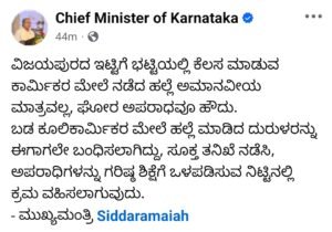 ವಿಜಯಪುರದ ಇಟ್ಟಿಗೆ ಭಟ್ಟಿಯಲ್ಲಿ ಕೆಲಸ ಮಾಡುವ ಕಾರ್ಮಿಕರ ಮೇಲೆ ನಡೆದ ಹಲ್ಲೆ ಅಮಾನವೀಯ ಮಾತ್ರವಲ್ಲ, ಘೋರ ಅಪರಾಧವೂ ಹೌದು. ಬಡ ಕೂಲಿಕಾರ್ಮಿಕರ ಮೇಲೆ ಹಲ್ಲೆ ಮಾಡಿದ ದುರುಳರನ್ನು ಈಗಾಗಲೇ ಬಂಧಿಸಲಾಗಿದ್ದು, ಸೂಕ್ತ ತನಿಖೆ ನಡೆಸಿ, ಅಪರಾಧಿಗಳನ್ನು ಗರಿಷ್ಠ ಶಿಕ್ಷೆಗೆ ಒಳಪಡಿಸುವ ನಿಟ್ಟಿನಲ್ಲಿ ಕ್ರಮ ವಹಿಸಲಾಗುವುದು ಎಂದು ಸಿಎಂ ಸಿದ್ದರಾಮಯ್ಯ ಹೇಳಿದ್ದಾರೆ.