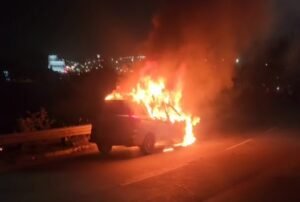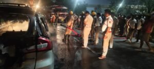 ಚಲಿಸುತ್ತಿದ್ದ ಕಾರಿನಲ್ಲಿ ಬೆಂಕಿ: ಧಗಧಗ ಉರಿದ ಕಾರು: ಕಾರಿನಲ್ಲಿದ್ದ ಏಳು ಮಂದಿ ಪ್ರಾಣಾಪಾಯದಿಂದ ಪಾರು