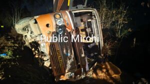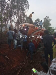 ಮಳೆಯಿಂದಾಗಿ ತಿರುವಿನಲ್ಲಿ ಚಾಲಕನ ನಿಯಂತ್ರಣ ತಪ್ಪಿರುವ ಬಸ್ ಪಲ್ಟಿ ಹೊಡೆದಿದೆ ಎನ್ನಲಾಗುತ್ತಿದೆ.