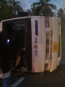 ಘಟನೆಯಲ್ಲಿ ವ್ಯಾನಿನಲ್ಲಿದ್ದವರಿಗೆ ಸಣ್ಣಪುಟ್ಟ ಗಾಯಗಳಾಗಿದ್ದು, ಅದೃಷ್ಟವಶಾತ್ ಪ್ರಾಣಾಪಾಯದಿಂದ ಪಾರಾಗಿದ್ದಾರೆ.
