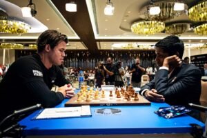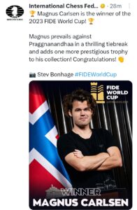 ಎಲ್ಲರ ಚಿತ್ತ ಚೆಸ್ ವಿಶ್ವಕಪ್ ನತ್ತ. ಅತೀವ ಕುತೂಹಲ ಮೂಡಿಸಿದ್ದ ಚೆಸ್ ವಿಶ್ವಕಪ್-2023 ಪಂದ್ಯಾವಳಿಯು ಗುರುವಾರ ನಡೆದ ಫೈನಲ್ ಟೈ ಬ್ರೇಕರ್ ಸ್ಪರ್ಧೆಯಲ್ಲಿ ಭಾರತದ ಆರ್. ಪ್ರಜ್ಞಾನಂದ ಎರಡೂ ಸುತ್ತಿನಲ್ಲೂ ಸೋಲು ಅನುಭವಿಸಿ ನಿರಾಸೆ ಅನುಭವಿಸಿದ್ದು, ಮ್ಯಾಗ್ನಸ್ ಕಾರ್ಲ್ಸನ್ ವಿಶ್ವ ಕಪ್ ಗೆಲ್ಲುವ ಮೂಲಕ ದಾಖಲೆ ಬರೆದಿದ್ದಾರೆ.