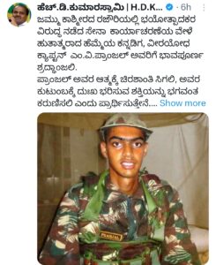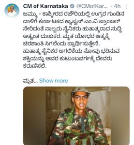 ಜಮ್ಮು – ಕಾಶ್ಮೀರದ ರಜೌರಿಯಲ್ಲಿ ಉಗ್ರರ ಗುಂಡಿನ ದಾಳಿಗೆ ಕರ್ನಾಟಕದ ಕ್ಯಾಪ್ಟನ್ ಎಂ.ವಿ ಪ್ರಾಂಜಲ್ ಸೇರಿದಂತೆ ನಾಲ್ವರು ಸೈನಿಕರು ಹುತಾತ್ಮರಾಗಿರುವ ಸುದ್ದಿ ಅತ್ಯಂತ ದುಃಖಕರ. ಮೃತ ಯೋಧರ ಆತ್ಮಕ್ಕೆ ಚಿರಶಾಂತಿ ಸಿಗಲೆಂದು ಪ್ರಾರ್ಥಿಸುತ್ತೇನೆ.