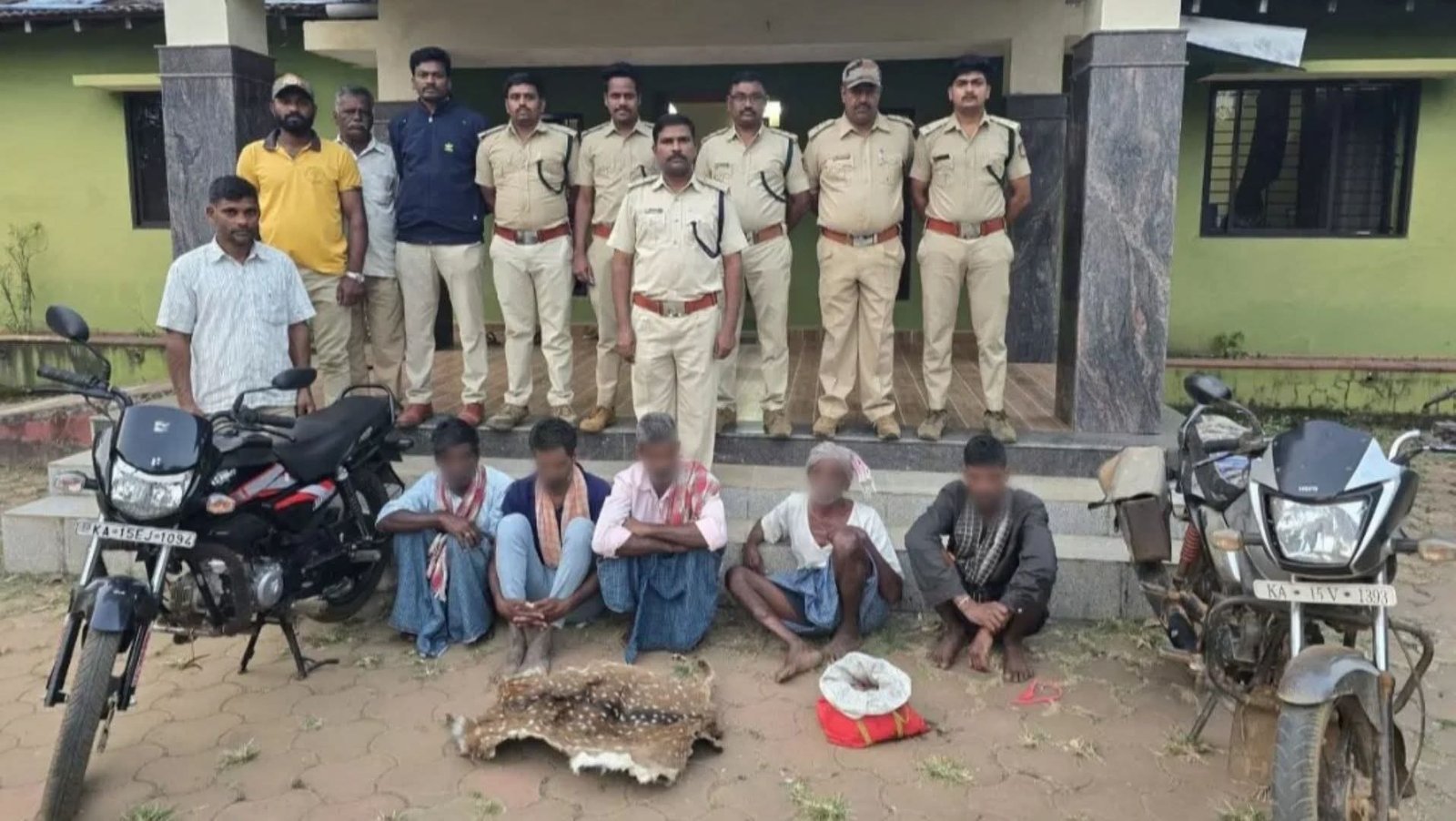 ಮುಂಡಗೋಡ: ತಾಲೂಕಿನ ಕಾತೂರು ಅರಣ್ಯ ವಲಯದ ವ್ಯಾಪ್ತಿಯಲ್ಲಿ ಜಿಂಕೆ ಚರ್ಮ ಹಾಗೂ ಕಾಡುಹಂದಿ ಮಾಂಸವನ್ನು ಅಕ್ರಮವಾಗಿ ಸಾಗಿಸುತ್ತಿದ್ದ ಐವರು ಆರೋಪಿಗಳನ್ನು ಅರಣ್ಯ ಇಲಾಖೆ ಅಧಿಕಾರಿಗಳು ರವಿವಾರ ಸಂಜೆ ಬಂಧಿಸಿದ್ದಾರೆ.