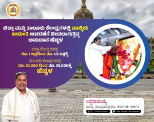 ತಾಲೂಕು ಕೇಂದ್ರಗಳಲ್ಲಿ ವಾಲ್ಮೀಕಿ ಜಯಂತಿಯ ಆಚರಣೆಗೆ 25ಸಾವಿರದಿಂದ 35ಸಾವಿರಕ್ಕೆ ಹೆಚ್ಚಳ. ಜಿಲ್ಲಾ ಕೇಂದ್ರಗಳಲ್ಲಿ ವಾಲ್ಮೀಕಿ ಜಯಂತಿಯ ಆಚರಣೆಗೆ ಒಂದು ಲಕ್ಷದಿಂದ ರೂ. 1.5 ಲಕ್ಷ ರೂಪಾಯಿಗೆ ಹೆಚ್ಚಳ ಮಾಡಲಾಗಿದೆ.