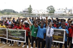 ಸರ್ವಜ್ಞ ನಗರದ ಜೀವನಹಳ್ಳಿಯಲ್ಲಿ ಫುಟ್ಬಾಲ್ ಟರ್ಫ್ ನಿರ್ಮಾಣಕ್ಕೆ ಕೇಳಿ ಬಂದಿರುವ ವಿರೋಧಕ್ಕೆ ಬಗ್ಗದೇ, ಕ್ರೀಡಾಂಗಣ ನಿರ್ಮಾಣ ಆಗಬೇಕೆಂದು ಆಗ್ರಹಿಸಿ ಸ್ಥಳೀಯರು ಕ್ರೀಡಾಂಗಣದ ಬಳಿ ಶನಿವಾರ ಪ್ರತಿಭಟನೆ ನಡೆಸಿದರು.