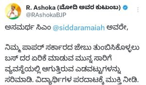 ಅಸಮರ್ಥ ಸಿಎಂ ಸಿದ್ದರಾಮಯ್ಯ ಅವರೇ, ನಿಮ್ಮ ಪಾಪರ್ ಸರ್ಕಾರದ ಜೇಬು ತುಂಬಿಸಿಕೊಳ್ಳಲು ಬಸ್ ದರ ಏರಿಕೆ ಮಾಡುವ ಮುನ್ನ.. ಸಾರಿಗೆ ವ್ಯವಸ್ಥೆಯಲ್ಲಿ ಆಗುತ್ತಿರುವ ಎಡವಟ್ಟುಗಳನ್ನು ಸರಿಮಾಡಿ. ವಿದ್ಯಾರ್ಥಿಗಳ ಪರದಾಟಕ್ಕೆ ಮುಕ್ತಿ ನೀಡಿ ಎಂದು ವಿರೋಧಪಕ್ಷದ ನಾಯಕ ಆರ್.ಅಶೋಕ್ ಅವರು ತಮ್ಮ ಎಕ್ಸ್ ಖಾತೆಯಲ್ಲಿ ಸರ್ಕಾರವನ್ನು ತರಾಟೆಗೆ ತೆಗೆದುಕೊಂಡಿದ್ದಾರೆ.
