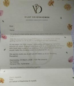 ಮಾರ್ಚ್ 4 ರಂದು ಬುಧವಾರ ಸಂಜೆ 7 ಗಂಟೆಯಿಂದ ಹೈದರಾಬಾದ್ನಲ್ಲಿರುವ ಬಂಜಾರಾ ಹಿಲ್ಸ್ನ ತಾಜ್ ಕೃಷ್ಣದಲ್ಲಿ ವಿಜಯ್ ದೇವರಕೊಂಡ – ರಶ್ಮಿಕಾ ಮಂದಣ್ಣ ರಿಸೆಪ್ಷನ್ ಜರುಗಲಿದೆ ಎಂದು ಪತ್ರಿಕೆಯಲ್ಲಿ ಬರೆಯಲಾಗಿದೆ.