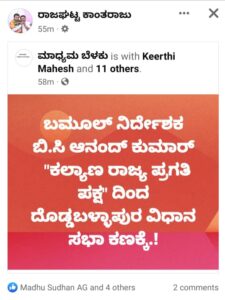 ‘ಕಲ್ಯಾಣ ರಾಜ್ಯ ಪ್ರಗತಿ ಪಕ್ಷ’ದಿಂದ ದೊಡ್ಡಬಳ್ಳಾಪುರ ಕ್ಷೇತ್ರದ ಅಭ್ಯರ್ಥಿಯಾಗಿ ಕೆಎಂಎಫ್ ನಿರ್ದೇಶಕ ಹಾಗೂ ಕಾಂಗ್ರೆಸ್ ಮುಖಂಡ ಬಿ.ಸಿ.ಆನಂದಕುಮಾರ್ ಕಣಕ್ಕಿಳಿಯಲಿದ್ದಾರೆ ಎಂಬ ವದಂತಿ ಫೇಸ್ ಬುಕ್ ಜಾಲತಾಣದಲ್ಲಿ ಹರಿದಾಡುತ್ತಿದೆ. ಈ ವದಂತಿಯನ್ನು ಬಿ.ಸಿ.ಆನಂದಕುಮಾರ್ ಸಾರಾಸಗಟಾಗಿ ತಳ್ಳಿಹಾಕಿದ್ದಾರೆ.