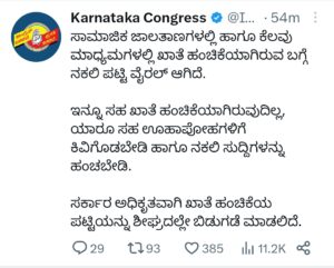 ನಕಲಿ ಸಚಿವ ಸ್ಥಾನ ಹಂಚಿಕೆ ಕುರಿತು ಪಟ್ಟಿ ಕುರಿತು ಟ್ವೀಟ್ ಮಾಡಿರುವ ಕೆಪಿಸಿಸಿ, ” ಸಾಮಾಜಿಕ ಜಾಲತಾಣಗಳಲ್ಲಿ ಹಾಗೂ ಕೆಲವು ಮಾಧ್ಯಮಗಳಲ್ಲಿ ಖಾತೆ ಹಂಚಿಕೆಯಾಗಿರುವ ಬಗ್ಗೆ ನಕಲಿ ಪಟ್ಟಿ ವೈರಲ್ ಆಗಿದೆ. ಇನ್ನೂ ಸಹ ಖಾತೆ ಹಂಚಿಕೆಯಾಗಿರುವುದಿಲ್ಲ, ಯಾರೂ ಸಹ ಊಹಾಪೋಹಗಳಿಗೆ ಕಿವಿಗೊಡಬೇಡಿ ಹಾಗೂ ನಕಲಿ ಸುದ್ದಿಗಳನ್ನು ಹಂಚಬೇಡಿ. ಸರ್ಕಾರ ಅಧಿಕೃತವಾಗಿ ಖಾತೆ ಹಂಚಿಕೆಯ ಪಟ್ಟಿಯನ್ನು ಶೀಘ್ರದಲ್ಲೇ ಬಿಡುಗಡೆ ಮಾಡಲಿದೆ ” ಎಂದು ತಿಳಿಸಿದೆ.