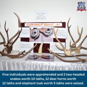 ಅಲ್ಲದೇ ಮತ್ತೊಂದು ಪ್ರಕರಣದಲ್ಲಿ 5 ಜನರನ್ನು ಬಂಧಿಸಿ ಸುಮಾರು 10 ಲಕ್ಷ ರೂಪಾಯಿ ಮೌಲ್ಯದ ಎರಡು ತಲೆ ಇರುವ 2 ಹಾವು, 12 ಲಕ್ಷ ಮೌಲ್ಯದ 12 ಜಿಂಕೆ ಕೊಂಬುಗಳು ಮತ್ತು 5 ಲಕ್ಷ ಮೌಲ್ಯದ ಆನೆ ದಂತಗಳನ್ನು ವಶಪಡಿಸಿಕೊಳ್ಳಲಾಗಿದೆ.