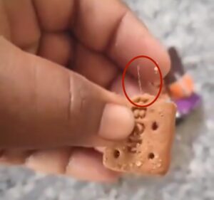 ಮಕ್ಕಳು ಬಿಸ್ಕತ್ ತಿನ್ನುವಾಗ ತೆಳು ಕಬ್ಬಿಣದ ತಂತಿ ಇರುವುದನ್ನು ಗಮನಿಸಿದ ತಂದೆ ಅದನ್ನು ವಿಡಿಯೋ ಮಾಡಿ ಸಾಮಾಜಿಕ ಜಾಲತಾಣಗಳಲ್ಲಿ ಹರಿಬಿಟ್ಟು ಮಕ್ಕಳಿಗೆ ಅಂಗಡಿಯ ತಿಂಡಿತಿನಿಸು ನೀಡುವಾಗ ಎಚ್ಚರಿಕೆ ವಹಿಸುವಂತೆ ಹೇಳಿದ್ದಾರೆ.