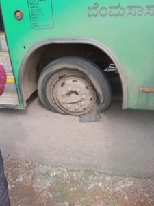 ಬಸ್ನ್ ಟೈರ್ ಸಾಕಷ್ಟು ಸವೆದಿದ್ದು ಸಂಬಂಧಪಟ್ಟ ಅಧಿಕಾರಿಗಳು ಈ ಟೈರ್ ಅನ್ನು ಬದಲಾವಣೆ ಮಾಡದೇ ಇಂದು ಚಾಲನೆ ಮಾಡಲು ಅನುಮತಿ ನೀಡಿ ತೀವ್ರ ನಿರ್ಲಕ್ಷ್ಯ ವಹಿಸಿರುತ್ತಾರೆ ಎಂದು ಪ್ರಯಾಣಿಕರ ಆಕ್ರೋಶ ವ್ಯಕ್ತಪಡಿಸಿದರು. ಈ ಬಗ್ಗೆ ಸೂಕ್ತ ಕ್ರಮ ಕೈಗೊಳ್ಳುವಂತೆ ಆಗ್ರಹಿಸಿದ್ದಾರೆ.
