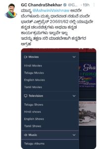 ಕೇಂದ್ರ ರೈಲ್ವೆ ಮಂತ್ರಿಗಳಾದ ಅಶ್ವಿನಿ ವೈಷ್ಣವ್ ಅವರೇ ಬೆಂಗಳೂರು ಮತ್ತು ಧಾರವಾಡ ನಡುವೆ ವಂದೇ ಭಾರತ್ ಎಕ್ಸ್ಪ್ರೆಸ್ 20661/62 ರಲ್ಲಿ ಯಾವುದೇ ಕನ್ನಡ ಚಲನಚಿತ್ರಗಳು ಅಥವಾ ಕನ್ನಡ ಕಾರ್ಯಕ್ರಮಗಳು ಇಲ್ಲವೇ ಇಲ್ಲ. ಇದನ್ನು ತಕ್ಷಣ ಸರಿ ಮಾಡಬೇಕಾಗಿ ಕನ್ನಡಿಗರ ಆಗ್ರಹ ಎಂದು ರಾಜ್ಯಸಭಾ ಸದಸ್ಯ ಜಿ.ಸಿ.ಚಂದ್ರಶೇಖರ್ ಅವರು ಟ್ವೀಟ್ ಮಾಡಿದ್ದಾರೆ.