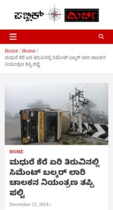 ತಾಲೂಕಿನ ಮಧುರೆ ಹೋಬಳಿಯ ಕೋಡಿಪಾಳ್ಯ ಸಮೀಪದಲ್ಲಿಂದು ಸಂಜೆ ಸುಮಾರು 5 ಗಂಟೆಯಲ್ಲಿ ಮಧುರೆ ಕೆರೆ ಏರಿ ತಿರುವಿನಲ್ಲಿ ಸಿಮೆಂಟ್ ಬಲ್ಕರ್ ಲಾರಿ ಚಾಲಕನ ನಿಯಂತ್ರಣ ತಪ್ಪಿ ಪಲ್ಟಿ ಹೊಡೆದಿದೆ.