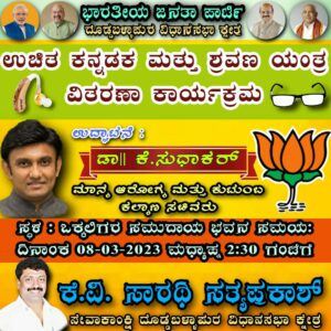 ಕಳೆದ ಎರಡು ತಿಂಗಳ ಹಿಂದೆ ನಗರದ ಭಗತ್ ಸಿಂಗ್ ಮೈದಾನದಲ್ಲಿ ಬೃಹತ್ ಆರೋಗ್ಯ ಶಿಬಿರ ಆಯೋಜನೆ ಮಾಡಿದ್ದರು. ಶಿಬಿರದಲ್ಲಿ ವಿವಿಧ ಅನಾರೋಗ್ಯ ಸಮಸ್ಯೆಗಳಿಂದ ಬಳಲುತ್ತಿರುವವರಿಗೆ ಬೆಂಗಳೂರಿನ ಖಾಸಗಿ ಆಸ್ಪತ್ರೆಗಳಲ್ಲಿ ಚಿಕಿತ್ಸೆ ಕೊಡಿಸಲಾಗಿತ್ತು. ಕಣ್ಣು, ಕಿವಿ ದೋಷಗಳುಳ್ಳವರಿಗೆ ನಾಳೆ ಕನ್ನಡಕ ಮತ್ತು ಶ್ರವಣ ದೋಷ ಯಂತ್ರಗಳನ್ನು ವಿತರಣೆ ಮಾಡಲಾಗುತ್ತಿದೆ. ಇದರ ಸದುಪಯೋಗ ಪಡಿಸಿಕೊಳ್ಳಲು ಮನವಿ ಮಾಡಿರುವ ಸಾರಥಿ ಸತ್ಯಪ್ರಕಾಶ್.