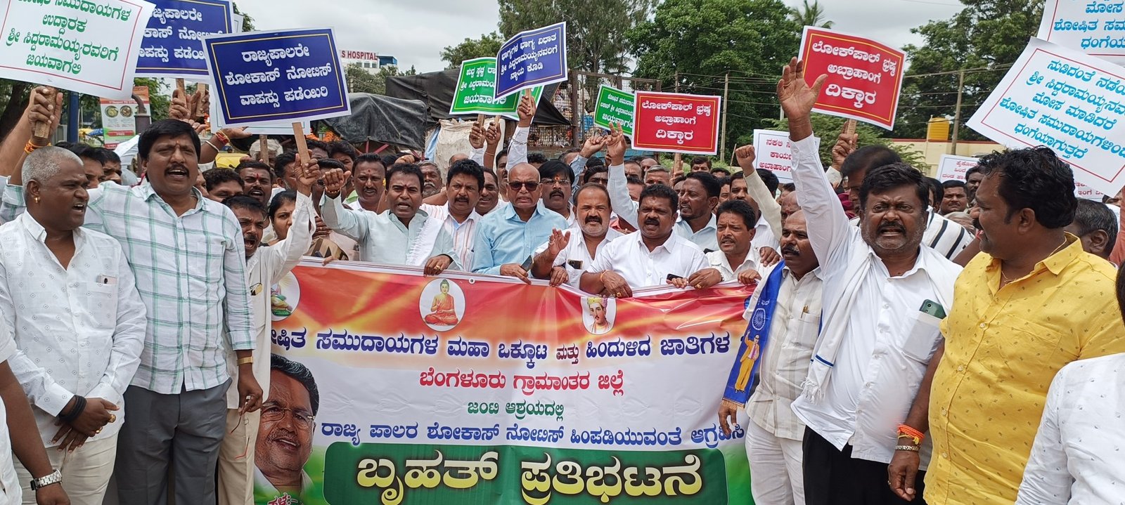 ಮುಡಾ ಹಗರಣ ಹಿನ್ನೆಲೆ ಸಿಎಂ ಸಿದ್ಧರಾಮಯ್ಯ ವಿರುದ್ಧ ರಾಜ್ಯಪಾಲರು ಹೊರಡಿಸಿರುವ ಶೋಕಾಸ್ ನೋಟಿಸ್ ನ್ನು ಖಂಡಿಸಿ ಕೂಡಲೇ ಶೋಕಾಸ್ ನೋಟಿಸ್ ಹಿಂಪಡೆಯುವಂತೆ ಒತ್ತಾಯಿಸಿ ದೊಡ್ಡಬಳ್ಳಾಪುರ ನಗರದ ಡಾ.ಬಿ.ಆರ್.ಅಂಬೇಡ್ಕರ್ ವೃತ್ತದಲ್ಲಿ ಮಾನವ ಸರಪಳಿ ನಿರ್ಮಿಸಿ ಕಾಂಗ್ರೆಸ್ ನಾಯಕರು ಬೃಹತ್ ಪ್ರತಿಭಟನೆ ನಡೆಸಿದ್ದಾರೆ.