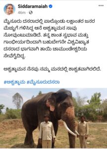 ಮೈಸೂರು ದಸರಾದಲ್ಲಿ ಪಾಲ್ಗೊಂಡು ಲಕ್ಷಾಂತರ ಜನರ ಮೆಚ್ಚುಗೆ ಗಳಿಸಿದ್ದ ಆನೆ ಅಶ್ವತ್ಥಾಮನ ಸಾವು ನೋವುಂಟುಮಾಡಿದೆ. ತನ್ನ ಶಾಂತ ಸ್ವಭಾವ ಮತ್ತು ಗಾಂಭೀರ್ಯದಿಂದಾಗಿ ಬಹುಬೇಗನೇ ವಿಶ್ವವಿಖ್ಯಾತ ದಸರಾದ ಭಾಗವಾಗಿ ತಾಯಿ ಚಾಮುಂಡೇಶ್ವರಿಯ ಸೇವೆಗೈದಿದ್ದ ಎಂದು ಸಿಎಂ ಸಿದ್ದರಾಮಯ್ಯ ಭಾವುಕರಾಗಿದ್ದಾರೆ
