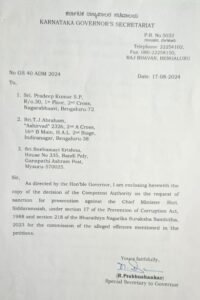 ಮೈಸೂರು ನಗರ ಅಭಿವೃದ್ಧಿ ಪ್ರಾಧಿಕಾರ(MUDA) ಪ್ರಕರಣಕ್ಕೆ ಸಂಬಂಧಪಟ್ಟಂತೆ ಸಾಮಾಜಿಕ ಕಾರ್ಯಕರ್ತ ಟಿ.ಜೆ ಅಬ್ರಹಾಂ ಅವರು ರಾಜ್ಯಪಾಲರಿಗೆ ನೀಡಿರುವ ದೂರಿನ ಆಧಾರ ಮೇಲೆ ಸಿಎಂ ಸಿದ್ದರಾಮಯ್ಯ ವಿರುದ್ಧ ಪ್ರಾಸಿಕ್ಯೂಷನ್ಗೆ ರಾಜ್ಯಪಾಲರು ಅನುಮತಿ ನೀಡಿದ್ದಾರೆ ಎಂದು ಖಚಿತ ಮಾಹಿತಿ ಲಭಿಸಿದೆ.