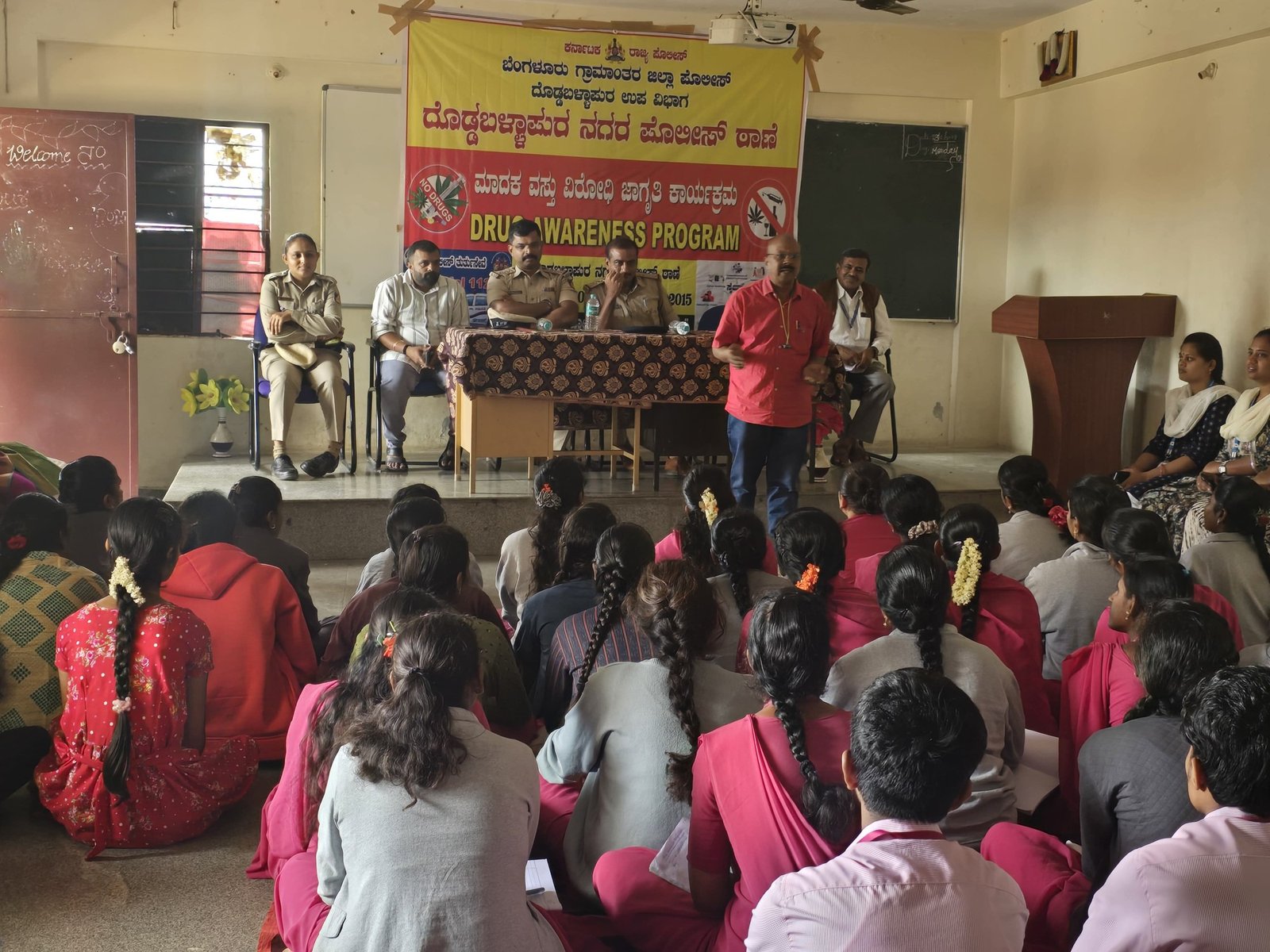 ಜೂನ್ 26 ಅಂತಾರಾಷ್ಟ್ರೀಯ ಮಾದಕವಸ್ತು ವ್ಯಸನ & ಅಕ್ರಮ ಕಳ್ಳಸಾಗಣೆಕೆ ವಿರೋಧಿ ದಿನದ ಅಂಗವಾಗಿ ಈ ದಿನ ದೊಡ್ಡಬಳ್ಳಾಪುರ ನಗರ ಪೊಲೀಸ್ ಠಾಣೆ ಇನ್ಸ್ ಪೆಕ್ಟರ್ ಹಾಗೂ ಮಹಿಳಾ ಠಾಣಾ ಇನ್ಸ್ ಪೆಕ್ಟರ್ ಡಾ. ನವೀನ್ ಕುಮಾರ್ ಎಂ.ಬಿ ನೇತೃತ್ವದಲ್ಲಿ ಶಾಲಾ-ಕಾಲೇಜು ವಿದ್ಯಾರ್ಥಿಗಳಿಗೆ ಮಾದಕ ವಸ್ತುಗಳ ಸೇವನೆಯಿಂದ ಉಂಟಾಗುವ ದುಷ್ಪರಿಣಾಮಗಳ ಬಗ್ಗೆ ಜಾಗೃತಿ ಮೂಡಿಸಿ ಮಾತನಾಡಿದ ಅವರು, ಯುವಶಕ್ತಿ ಈ ದೇಶದ ಬಹು ದೊಡ್ಡ ಆಸ್ತಿ. ಆ ಅಸ್ತಿಯನ್ನು ಜೋಪಾನದಿಂದ ಕಾಪಾಡಬೇಕಾದ ಜವಾಬ್ದಾರಿ ನಮ್ಮೆಲ್ಲರ ಮೇಲಿದೆ. ಯುವಕರು ಉತ್ತಮ ಹವ್ಯಾಸಗಳನ್ನು ಬೆಳೆಸಿಕೊಂಡು ಒಳ್ಳೆಯ ಜೀವನ ರೂಪಿಸಿಕೊಳ್ಳಬೇಕು ಎಂದರು.