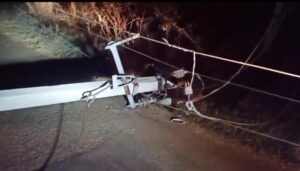 ರಸ್ತೆ ಪಕ್ಕದ ವಿದ್ಯುತ್ ಕಂಬಕ್ಕೆ ಕಾರು ಡಿಕ್ಕಿ ಹೊಡೆದ ಪರಿಣಾಮ ರಸ್ತೆಗೆ ಅಡ್ಡಲಾಗಿ ವಿದ್ಯುತ್ ಕಂಬ ಉರುಳಿಬಿದ್ದಿದೆ.
