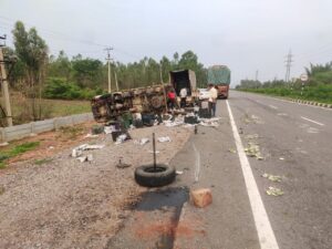 ಮಾವಿನ ಕಾಯಿ ತುಂಬಿದ್ದ ಟಾಟಾ ಏಸ್ ರಸ್ತೆ ಬದಿ ನಿಂತಿತ್ತು, ಲಾರಿ ಡಿಕ್ಕಿ ಹೊಡೆದಿದ್ದರಿಂದ ಮಾವಿನ ಹಣ್ಣುಗಳು ಮಣ್ಣುಪಾಲಾಗಿವೆ, ಟಾಟಾ ಏಸ್ ನ ಕೆಲ ಭಾಗಗಳು ಜಖಂಗೊಂಡಿವೆ. ಅದೃಷ್ಟವಶಾತ್ ಯಾವುದೇ ಪ್ರಾಣಾಪಾಯ ಸಂಭವಿಸಿಲ್ಲ.