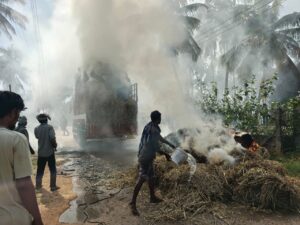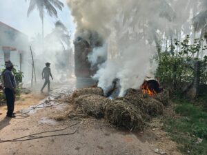 ಪಕ್ಕದಲ್ಲೇ ಇದ್ದ ರೈತರ ಹುಲ್ಲಿನ ಬಣವೆಗೂ ಬೆಂಕಿ ಆವರಿಸಿದೆ. ಗ್ರಾಮಸ್ಥರಿಂದ ಅಗ್ನಿಶಾಮಕ ಸಿಬ್ಬಂದಿಗೆ ಮಾಹಿತಿ ನೀಡಿದರು.