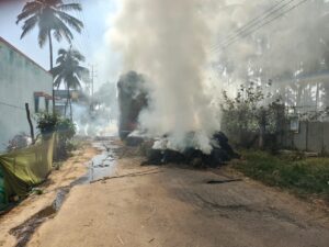 ಅಗ್ನಿಶಾಮಕ ಸಿಬ್ಬಂದಿ ಬರುವುದು ತಡವಾದ ಹಿನ್ನೆಲೆ ಗ್ರಾಮಸ್ಥರಿಂದಲೇ ಬೆಂಕಿ ನಂದಿಸುವ ಯತ್ನ ನಡೆದಿದೆ.