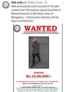 ಬೆಂಗಳೂರಿನ ರಾಮೇಶ್ವರಂ ಕೆಫೆ ಸ್ಫೋಟ ಪ್ರಕರಣದಲ್ಲಿ ಬಾಂಬರ್ ಬಗ್ಗೆ ಮಾಹಿತಿ ನೀಡಿದವರಿಗೆ ರಾಷ್ಟ್ರೀಯ ತನಿಖಾ ಸಂಸ್ಥೆ 10 ಲಕ್ಷ ರೂಪಾಯಿ ನಗದು ಬಹುಮಾನ ಘೋಷಿಸಿದೆ.