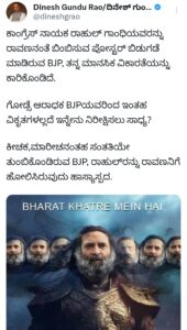 ಕಾಂಗ್ರೆಸ್ ನಾಯಕ ರಾಹುಲ್ ಗಾಂಧಿಯವರನ್ನು ರಾವಣನಂತೆ ಬಿಂಬಿಸುವ ಪೋಸ್ಟರ್ ಬಿಡುಗಡೆ ಮಾಡಿರುವ BJP, ತನ್ನ ಮಾನಸಿಕ ವಿಕಾರತೆಯನ್ನು ಕಾರಿಕೊಂಡಿದೆ ಎಂದು ಸಚಿವ ದಿನೇಶ್ ಗುಂಡುರಾವ್ ಕಿಡಿಕಾರಿದ್ದಾರೆ.