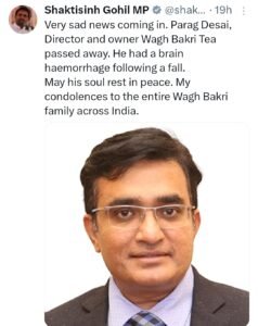 ಅದೇ ರೀತಿ ಪರಾಗ್ ದೇಸಾಯಿ ಅವರ ಸಾವಿಗೆ ತಮ್ಮ ಎಕ್ಸ್ ಖಾತೆಯಲ್ಲಿ ಸಂತಾಪ ಸೂಚಿಸಿರುವ ಗುಜರಾತ್ ಕಾಂಗ್ರೆಸ್ ನಾಯಕ ಶಕ್ತಿ ಸಿನ್ ಗೋಹಿಲ್ , ‘ಇದು ತುಂಬ ದುಃಖದ ಸುದ್ದಿಯಾಗಿದೆ. ಮೆದುಳು ರಕ್ತಸ್ರಾವದಿಂದ ವಾಫ್ ಬಕ್ರಿ ಟೀ ಗ್ರೂಪ್ನ ಮಾಲೀಕ ಮತ್ತು ನಿರ್ದೇಶಕ ಪರಾಗ್ ದೇಸಾಯಿ ಅವರು ನಿಧನರಾಗಿದ್ದಾರೆ. ಅವರ ಆತ್ಮಕ್ಕೆ ಶಾಂತಿ ಸಿಗಲಿ’ ಎಂದು ಹೇಳಿದ್ದಾರೆ.