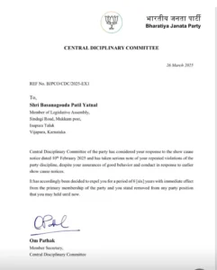 ವಿಜಯಪುರ ಶಾಸಕ ಬಸನಗೌಡ ಪಾಟೀಲ್ ಯತ್ನಾಳ್ ಅವರನ್ನು ಬಿಜೆಪಿ ಪ್ರಾಥಮಿಕ ಸದಸ್ಯತ್ವದಿಂದ 6 ವರ್ಷಗಳ ಕಾಲ ಉಚ್ಛಾಟನೆ ಮಾಡಿ ಆದೇಶ ಹೊರಡಿಸಲಾಗಿದೆ.