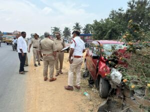 ಹೌದು ಹೀಗೆ ನಜ್ಜುಗುಜ್ಜಾದ ಕಾರು, ಸ್ಥಳ ಪರಿಶೀಲನೆಗೆ ಮುಂದಾಗಿರುವ ಬೆಂಗಳೂರು ಗ್ರಾಮಾಂತರ ಎಸ್ಪಿ ಸಿಕೆ ಬಾಬಾ, ಈ ಎಲ್ಲಾ ದೃಶ್ಯಗಳು ಕಂಡುಬಂದಿದ್ದು ನೆಲಮಂಗಲ ಸಮೀಪದ ಡಾಬಸ್ ಪೇಟೆ ಬಳಿ. ಇಂದು ಬೆಳಗ್ಗೆ ಸಂಭವಿಸಿದ ರಸ್ತೆ ಅಪಘಾತದಲ್ಲಿ ಒಂದೇ ಕುಟುಂಬದ ಗೋಪಾಲ್(60) ಶಶಿಕಲಾ(55) ದೀಪಿಕಾ (35)  ಸಾವನಪ್ಪಿದ್ದಾರೆ.  ಶಶಿಕಲಾ ಮುಂಬದಿಯ ಸೀಟ್ ನಲ್ಲಿ ಕುಳಿತ್ತಿದ್ದರು, ಅವರ ಹಿಂಭಾಗದಲ್ಲಿ ದೀಪಿಕಾ ಕುಳಿತಿದ್ದರಿಂದ ಅಪಘಾತದ ರಭಸಕ್ಕೆ ಇಬ್ಬರು ಸ್ಥಳದಲ್ಲೇ ಸಾವನಪ್ಪಿದ್ದಾರೆ. ಗಾಯಾಳು ಚಾಲಕ ಗೋಪಾಲ್ ರನ್ನು ಖಾಸಗಿ ಆಸ್ಪತ್ರೆಗೆ ರವಾನಿಸಿದ್ದಾರೆ. ಆದರೆ, ಚಿಕಿತ್ಸೆ ಫಲಕಾರಿ ಆಗದೆ ಆತ‌ ಕೂಡ ಸಾವನಪ್ಪಿದ್ದಾನೆ. ಇನ್ನೂ ಕಾರಿನಲ್ಲಿ ಇಬ್ಬರು ಮಕ್ಕಳಿದ್ದು, ಇಬ್ಬರೂ ಕೂಡ ಪ್ರಾಣಾಪಾಯದಿಂದ ಪಾರಾಗಿದ್ದಾರೆ.