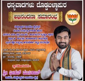 2023ನೇ ಕರ್ನಾಟಕ ರಾಜ್ಯದ ವಿಧಾನಸಭೆಯ ಸಾರ್ವತ್ರಿಕ ಚುನಾವಣೆಯಲ್ಲಿ ಶಾಸಕ ಧೀರಜ್ಮುನಿರಾಜ್ ಅವರಿಗೆ ಬೆಂಬಲವನ್ನು ನೀಡಿ, ಗೆಲುವಿಗೆ ಕಾರಣಕರ್ತರಾದ ತಾಲ್ಲೂಕಿನ ಭಾರತೀಯ ಜನತಾ ಪಾರ್ಟಿಯ ಎಲ್ಲಾ ಸ್ತರದ ಪದಾಧಿಕಾರಿಗಳು, ಕಾರ್ಯಕರ್ತರು ಹಾಗೂ ತಾಲ್ಲೂಕಿನ ಮಹಾ ಜನತೆಗೆ ಕೃತಜ್ಞತೆಯ ಸಲ್ಲಿಸುವ ಸಲುವಾಗಿ ಜೂನ್ 9ರ ಶುಕ್ರವಾರ ಬೆಳಗ್ಗೆ 10:30ಕ್ಕೆ ನಗರದ ಡಿಕ್ರಾಸ್ ಬಳಿಯ ಶಾಸಕ ಧೀರಜ್ಮುನಿರಾಜ್ ಅವರ ಮನೆ ಮುಂಭಾಗ ಅಭಿನಂದನಾ ಕಾರ್ಯಕ್ರಮವನ್ನು ಹಮ್ಮಿಕೊಳ್ಳಲಾಗಿದೆ.