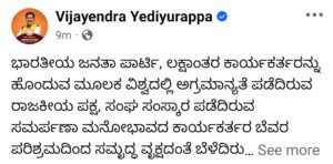 ಪಕ್ಷದ ಹಿರಿಯರು ಹಾಗೂ ವರಿಷ್ಠರು ಈ ವಿಷಯದಲ್ಲಿ ಎಂದಿಗೂ ರಾಜಿ ಮಾಡಿಕೊಂಡಿರುವ ಉದಾಹರಣೆ ನಮ್ಮ ಮುಂದಿಲ್ಲ, ಸದ್ಯ Basanagouda Patil Yatnal ರವರ ವಿರುದ್ಧದ ಶಿಸ್ತುಕ್ರಮ ವರಿಷ್ಠರು ಸುದೀರ್ಘ ಅವಧಿಯಿಂದ ಸ್ಥಿತಿ-ಗತಿಗಳನ್ನು ಅವಲೋಕಿಸಿ ಅನಿವಾರ್ಯವಾಗಿ ತೆಗೆದುಕೊಂಡಿರುವ ಕ್ರಮವಾಗಿರುತ್ತದೆ. ಪಕ್ಷದ ಬೆಳವಣಿಗೆಯಲ್ಲಿನ ಕಹಿ ಘಟನೆಗಳನ್ನು ಉಲ್ಲೇಖಿಸಿ ಪಕ್ಷದ ವರಿಷ್ಠರಿಗೆ ನಾನು ಎಂದೂ ದೂರುಗಳನ್ನು ಹೇಳಿಕೊಂಡಿಲ್ಲ, ದಾಖಲಿಸಿಯೂ ಇಲ್ಲ. ಪೂಜ್ಯ ತಂದೆ ಯಡಿಯೂರಪ್ಪನವರು ಎಲ್ಲರನ್ನೂ ಸಮಚಿತ್ತ ಭಾವದಿಂದ ನೋಡಿ, ಪಕ್ಷವನ್ನು ಕುಟುಂಬದಂತೆ ಬೆಳೆಸಿದ ಮಾದರಿಯಲ್ಲಿಯೇ ನಡೆಯಬೇಕೆಂಬ ಸಂಕಲ್ಪ ಹೊತ್ತು, ಸಂಘದ ಹಿರಿಯರು ಮತ್ತು ಪಕ್ಷದ ಹಿರಿಯರ ಮಾರ್ಗದರ್ಶನದಲ್ಲಿ ಮುನ್ನಡೆಯುತ್ತಿದ್ದೇನೆ.