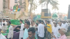 ಶಾಂತಿದೂತ ಮಾನವತಾವಾದಿ ವಿಶ್ವ ಪ್ರವಾದಿ ಮಹಮದ್ ಪೈಗಂಬರ್ ಜನ್ಮ ದಿನಾಚರಣೆ ಅಂಗವಾಗಿ ನಡೆದ ಈದ್ ಮಿಲಾದ್ ಆಚರಣೆಯಲ್ಲಿ ಮುಸ್ಲಿಂ ಬಾಂಧವರು ಪರಸ್ಪರ ಈದ್ ಶುಭಾಶಯಗಳನ್ನು ಕೋರುವ ಮೂಲಕ ಸಂಭ್ರಮಿಸಿದರು.